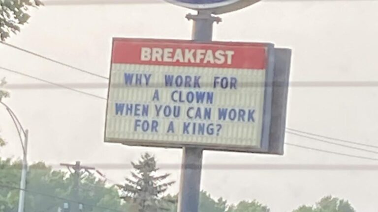 A Burger King sign reads, WHY WORK FOR A CLOWN WHEN YOU CAN WORK FOR A KING?