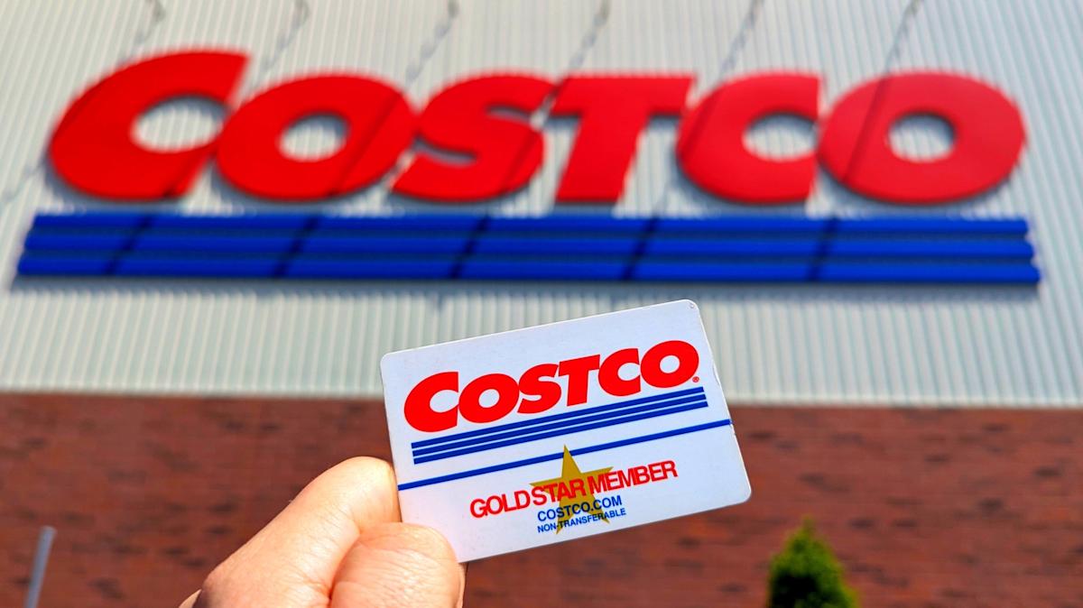 A person’s hand holding a Costco gold star member card in front of a Costco store sign – PJ McDonnell/Shutterstock